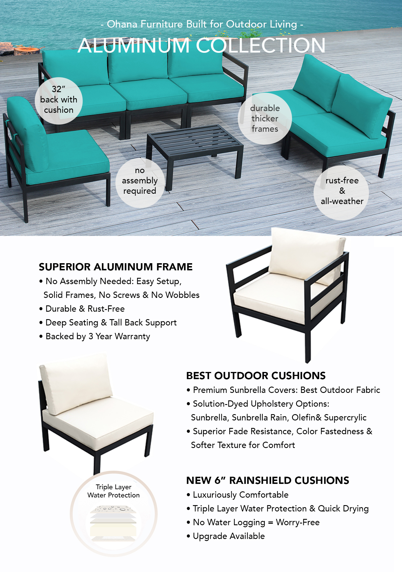 Ohana Depot 6 Piece Aluminum Outdoor Patio Sectional Set with Sunbrella Options - No Assembly Required