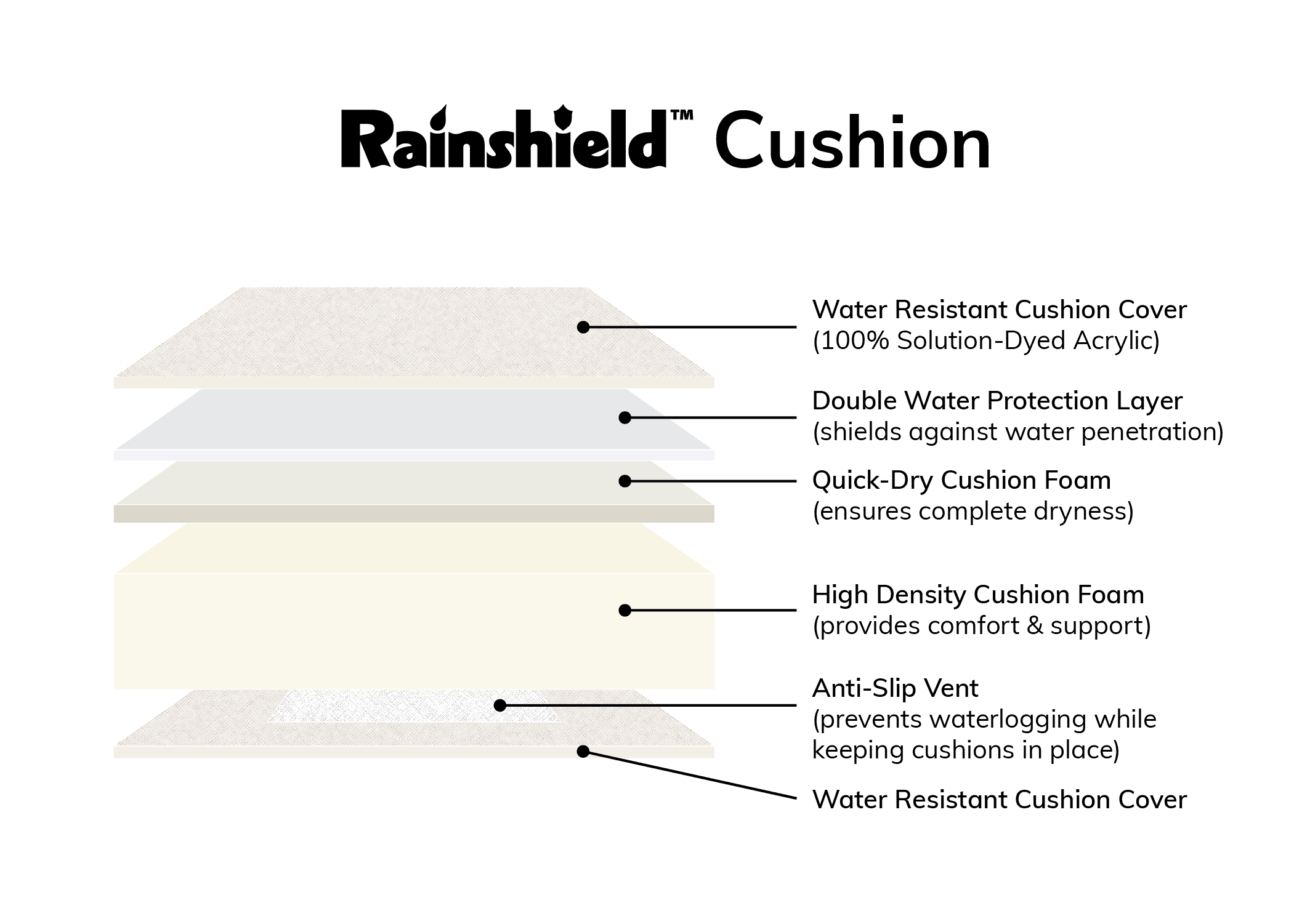 - Worry-free - No water logging, quick drying 6" cushions with triple layer water protection