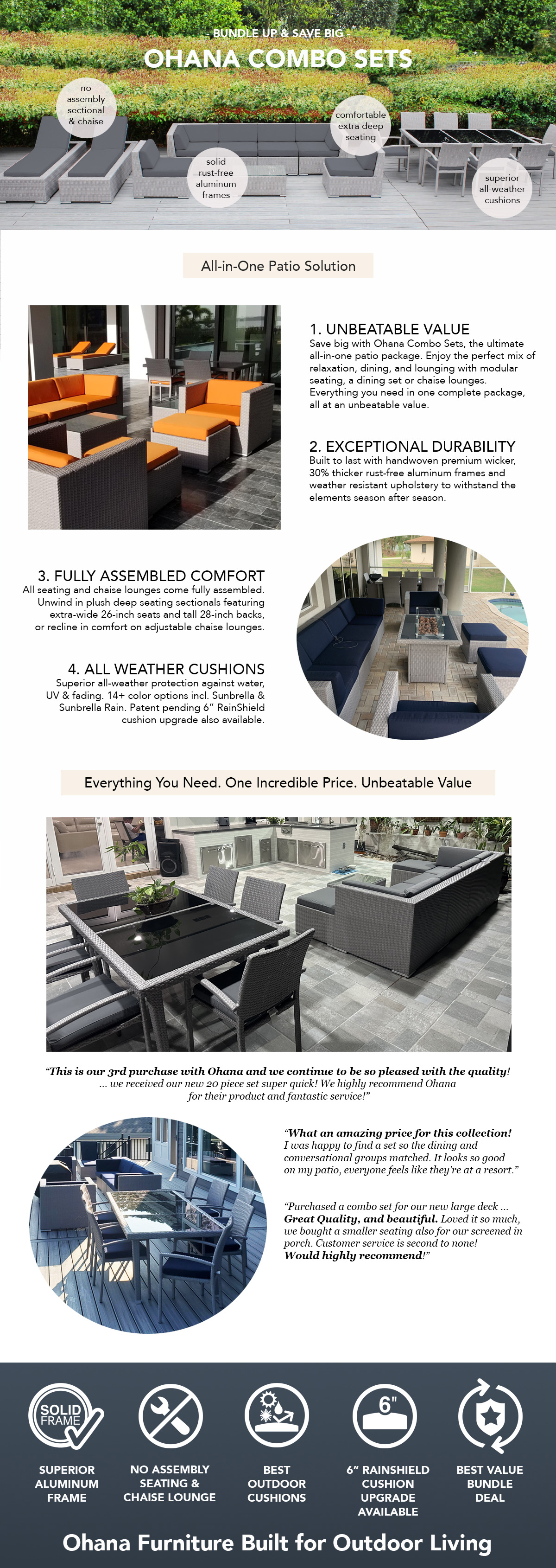 Ohana's 16-piece outdoor patio furniture set is a true value set with deep seating set, dining set and chaise lounge set. Deep seating sectional is made with top quality all-weather PE resin wicker and rust-free powder coated aluminum frame to withstand the outdoors. Seating set features 28" tall back for extra comfort and modular design. Outdoor dining table is topped with tempered glass and comes with wicker dining chairs with cushions. Chaise lounge chair has 4 adjustable height settings. Use the outdoor furniture set as shown or configure to suit your needs. You'll love this patio furniture set!