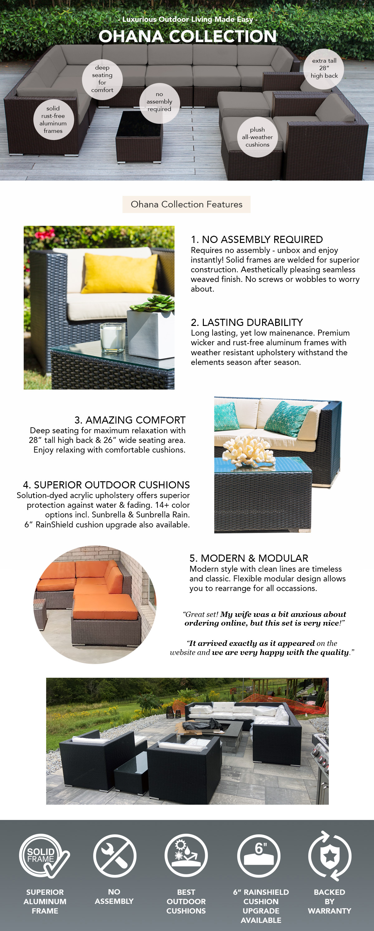 Transform your outdoor space with effortless comfort and modern style. This all-weather outdoor sectional arrives fully assembled, so you can start relaxing the moment it’s delivered - no tools, no hassle. Crafted with a durable, weather-resistant frame and water & fade resistant cushions, Ohana sectionals are designed to withstand sun, rain, and everyday use season after season. The modular design offers plenty of room for family and friends, making it perfect for patios, decks, and poolside lounging.