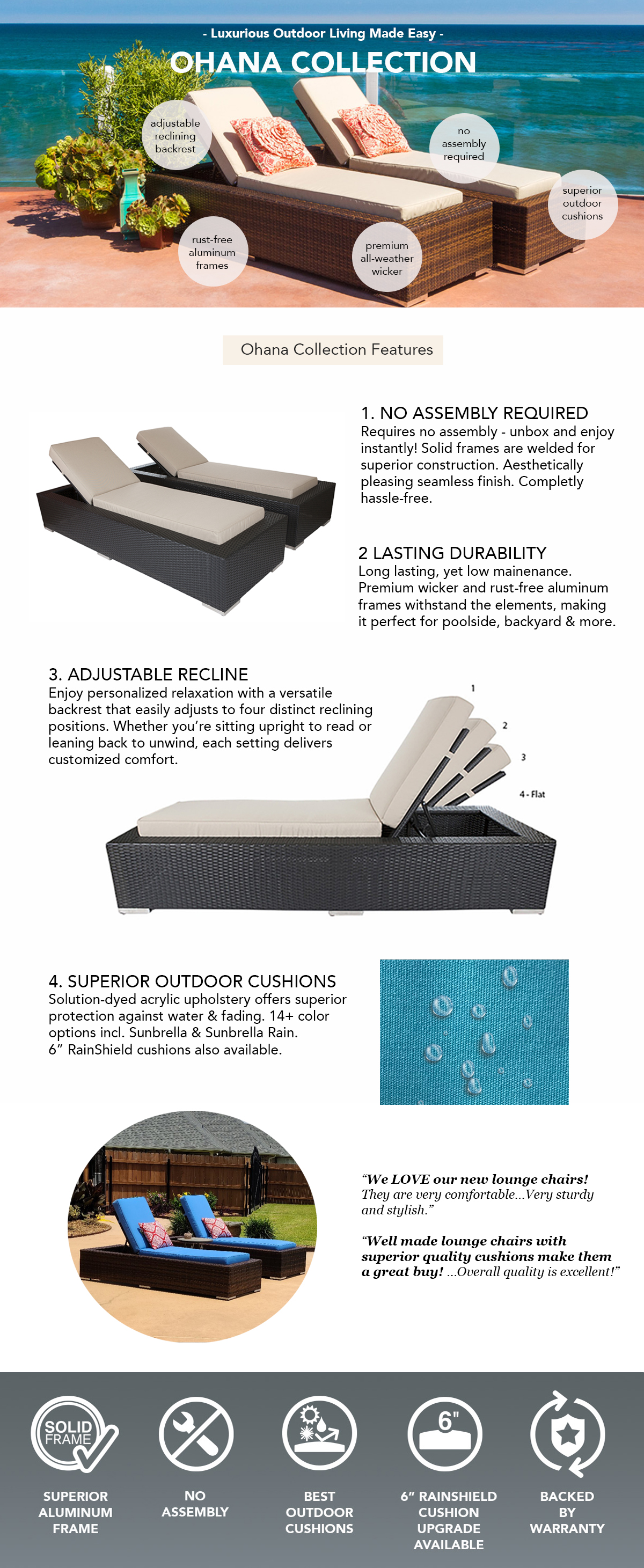 Enjoy the perfect blend of comfort and durability with our outdoor chaise lounge. Designed for patios, poolsides, and backyards, it features a weather-resistant frame, plush cushions wrapped in weather resistant fabric, and adjustable reclining positions for ultimate relaxation. Sleek, stylish, and built to last - make it your ideal spot for soaking up the sun.