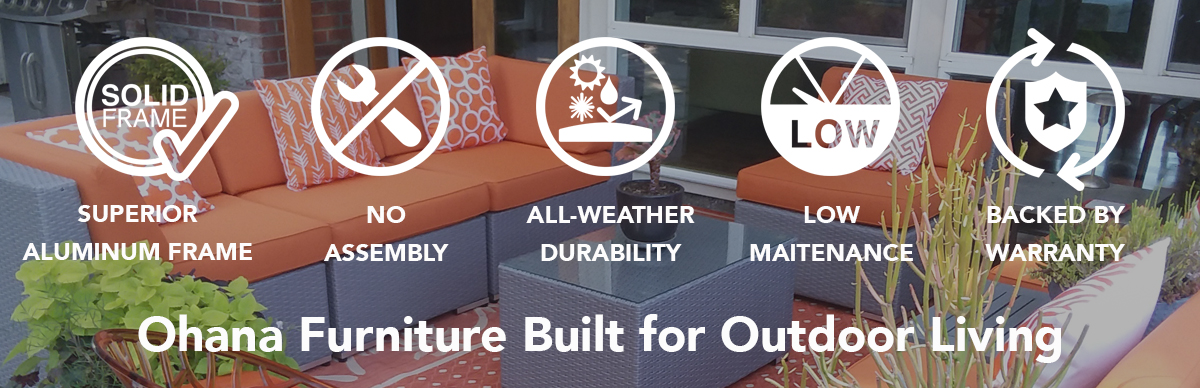 [TOP SELLER] Elevate your outdoor space with Ohana 7-piece outdoor patio seating set (PN0704) with 2 ottomans. This all-weather patio furniture requires no assembly and can be used right out of the box. Solidly constructed with top-quality PE resin wicker handwoven around a rust-free powder-coated aluminum frame, it is designed to withstand the elements. Cushions are zippered in easy-to-clean, weather-resistant Sunbrella or Supercrylic cushions in vibrant colors. Modular design allows you to be flexible with your seating arrangements from cozy gatherings to big groups. Complimentary protective cover and chair clips are provided so you can enjoy your furniture for a long time. See customer reviews to see why this set is our one of our top sellers.