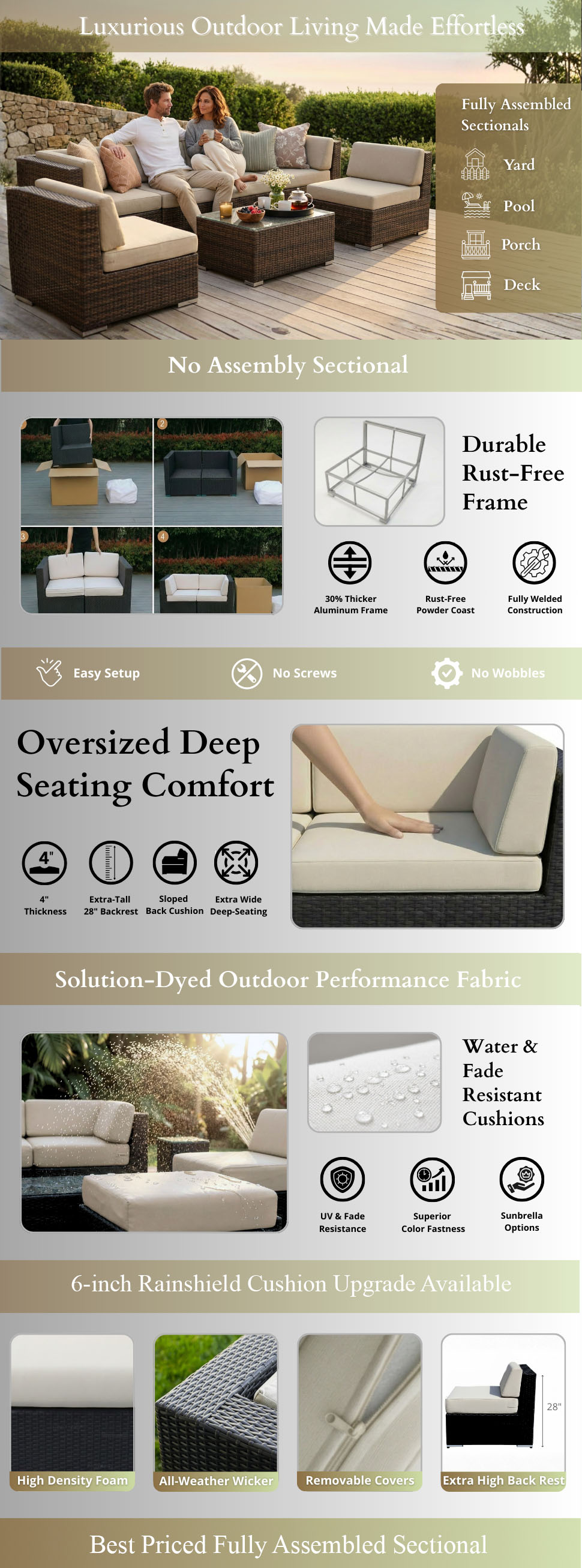 Cozy outdoor conversation set in all-weather wicker with weather resistant cushions is what you need for your patio, big or small. Ohana 5 piece outdoor seating set is made with top quality all-weather PE resin wicker hand-woven around rust-free powder coated aluminum frame to withstand the outdoor elements. Zippered weather resistant cushions are meant for outdoors and are available in vibrant colors. Modular design lets you use this patio furniture set as a sofa or love-seats by configuring to suit your needs. Best of all, no assembly is required and you can enjoy it right out of the box! You'll love this modern outdoor patio furniture set.