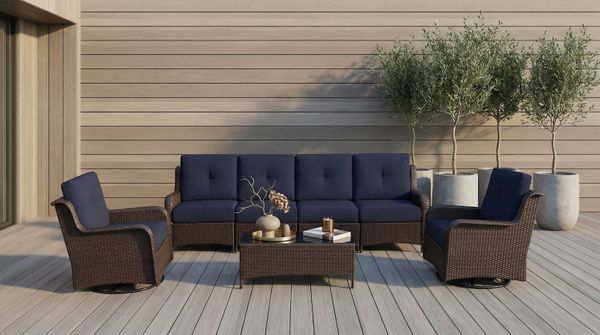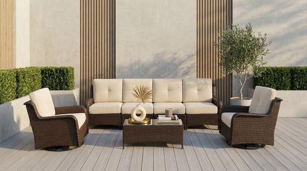 Bring timeless comfort to your outdoor space with this traditional high-back patio furniture set, designed for both style and durability. Plush 6" all-weather cushions offer exceptional support, while the high backs invite you to relax longer. Smooth-glide swivel chairs add effortless movement, perfect for entertaining or enjoying the view. Built to withstand the elements, this set delivers classic elegance season after season.