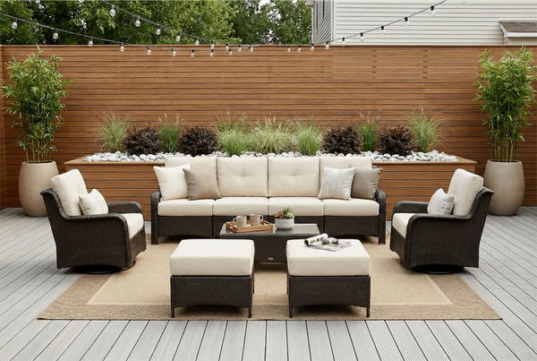 Bring timeless comfort to your outdoor space with this traditional high-back patio furniture set, designed for both style and durability. Plush 6" all-weather cushions offer exceptional support, while the high backs invite you to relax longer. Smooth-glide swivel chairs add effortless movement, perfect for entertaining or enjoying the view. Built to withstand the elements, this set delivers classic elegance season after season.